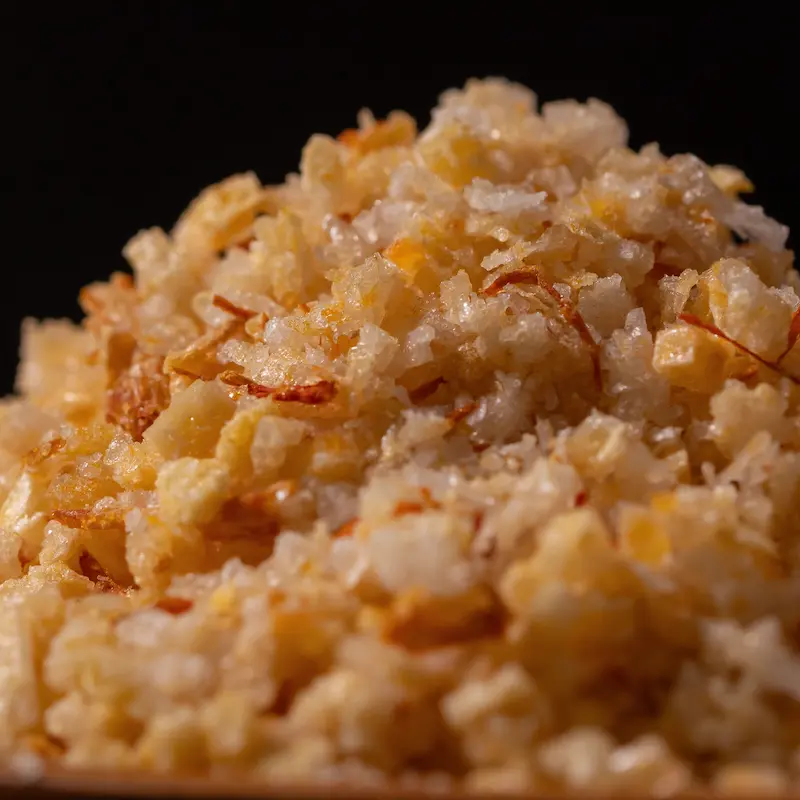 As the process completes, the saffron is no longer separate from the salt. It is carried within it. The crystals take on a natural orange-gold tone and a warm, hay-like saffron aroma.